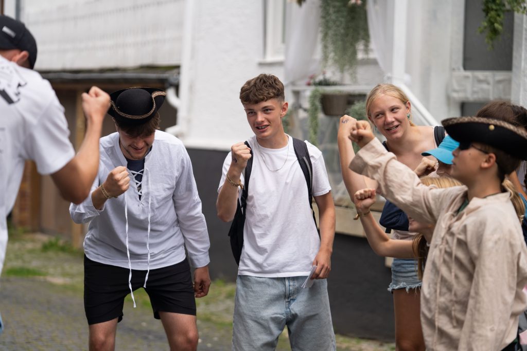 Heute morgen sind wir nach einer wilden Nacht aufgewacht. Überfäller haben 7 unserer kinderbanner geklaut! Um die wieder zu bekommen mussten die Gruppen, deren Banner geklaut wurden viele verschiedene Dinge machen: Sprinten, das ganze Frühstück über Piratenhüte tragen oder das Geschirr der Überfäller spülen. Nach dem Frühstück wurden wir in Gruppen aufgeteilt und haben unsere Rucksäcke gepackt – heute war nämlich das Stadtspiel! Dabei wurden wir in 7-9er Gruppen aufgeteilt und mussten an vielen Stationen Aufgaben bewältigen, um Bauteile zu sammeln, die uns weitere Hinweise zum Standort unseres Schiffes geben. Die coolsten Stationen waren z.B. Holzbeinlauf, den Zeltlager-Clubtanz vorführen oder aus Papier eine Kugelbahn bauen und gemeinsam einen Ball zum Ziel leiten.